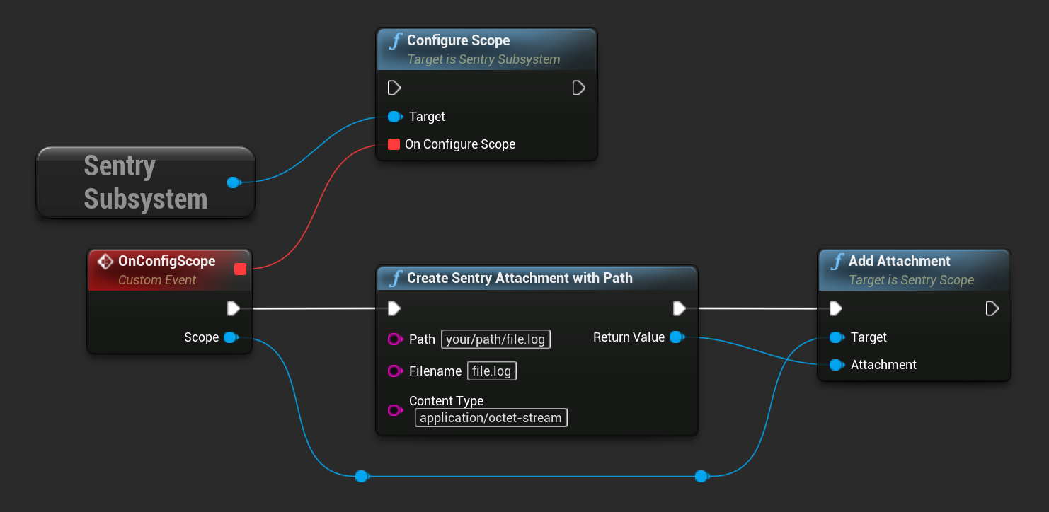 The same result can be achieved by calling the CreateSentryAttachmentWithData function in blueprint.