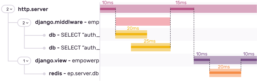 In the example below, the self time of each span is highlighted by the darker areas. For example, the http.server